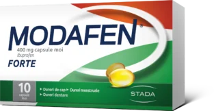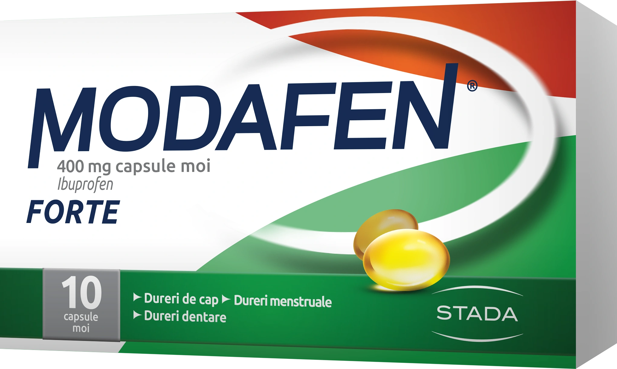Ibuprofen 400 mg, substanța activă din Modafen Forte, aparține unui grup de medicamente denumite medicamente antiinflamatoare nesteroidiene (AINS). Aceste medicamente asigură ameliorare prin schimbarea felului în care corpul răspunde la durere și la febră, au efect analgezic, antiinflamator și antipiretic. Datorită formei farmaceutice de capsulă moale, Modafen Forte 400mg se absoarbe rapid și acţionează prompt.